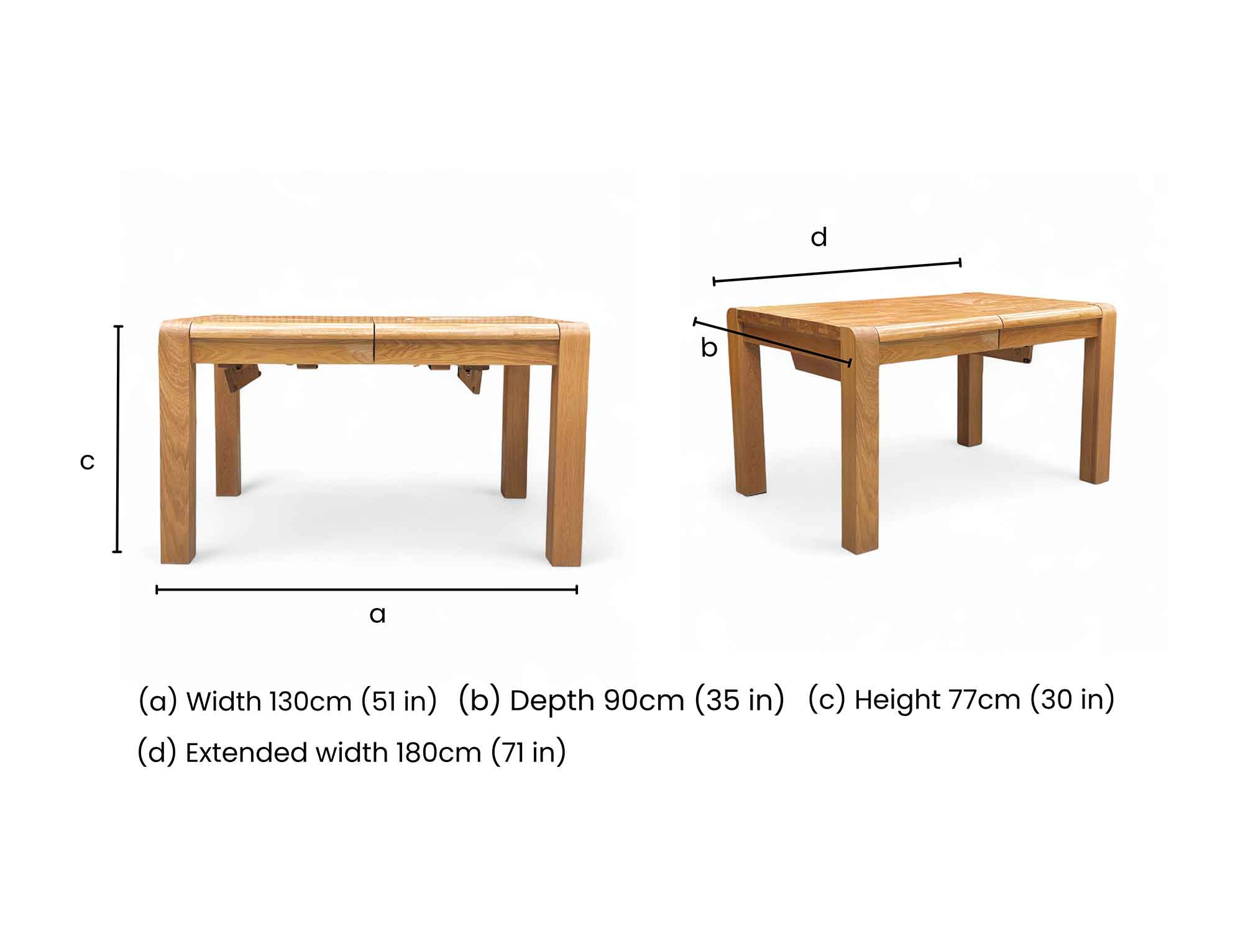 - This rectangular table has a tabletop made of oak, measuring 130 cm in length, 77 cm in height, and 90 cm in width.