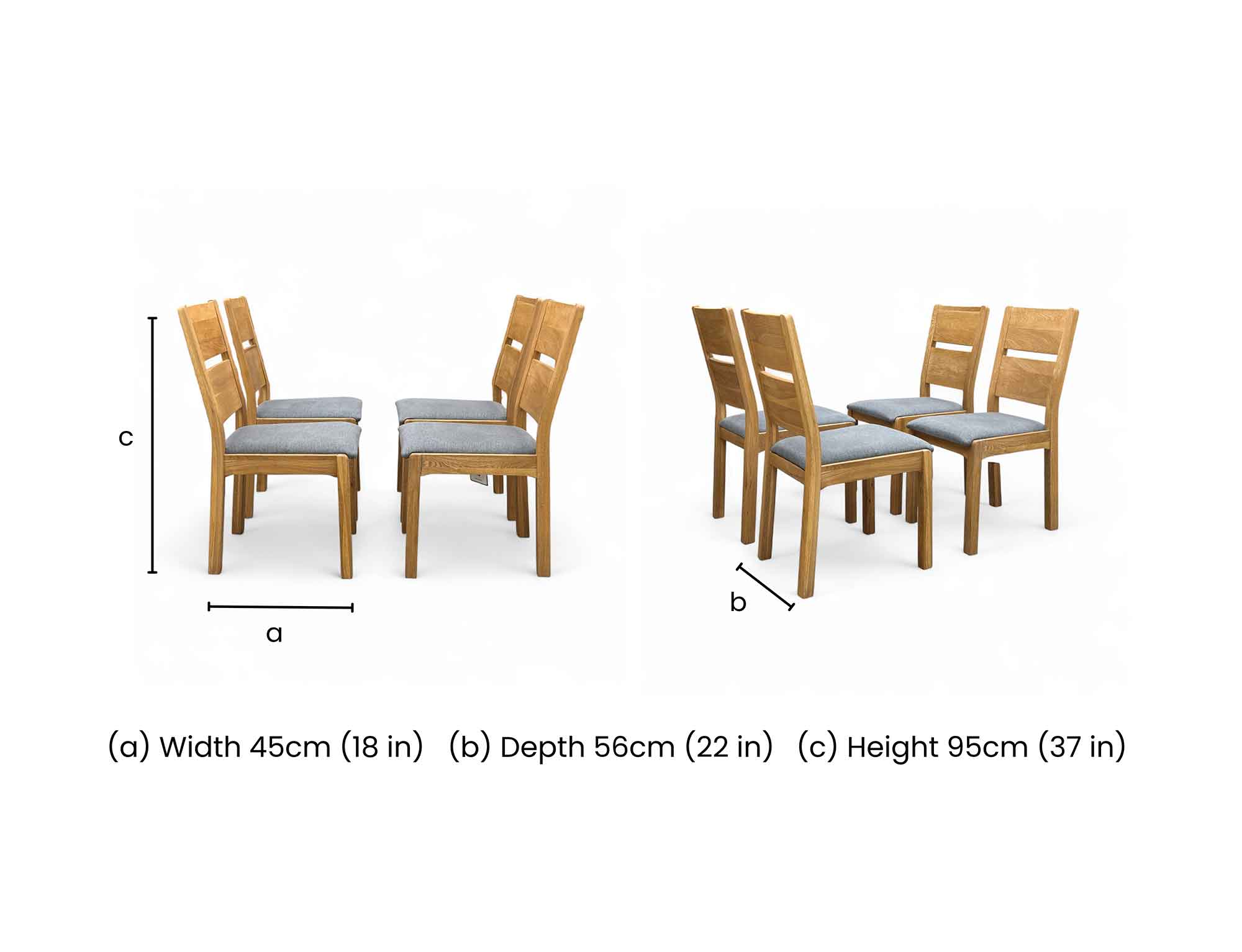 - These upholstered chairs are made of medium wood and fabric, measuring 56 cm in length and 43 cm in width.