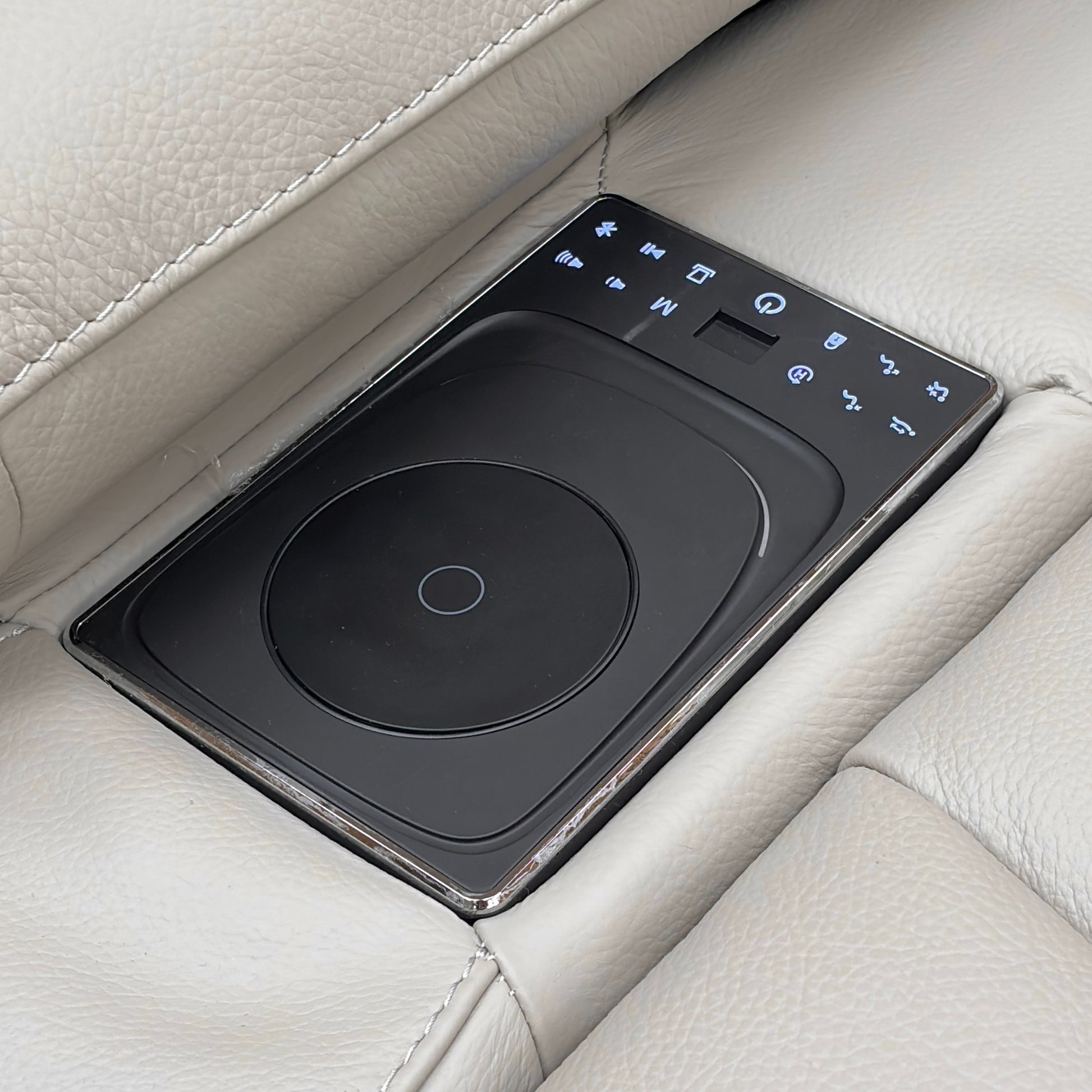 - Each panel has Bluetooth and sound controls plus wireless charging and a cup holder.