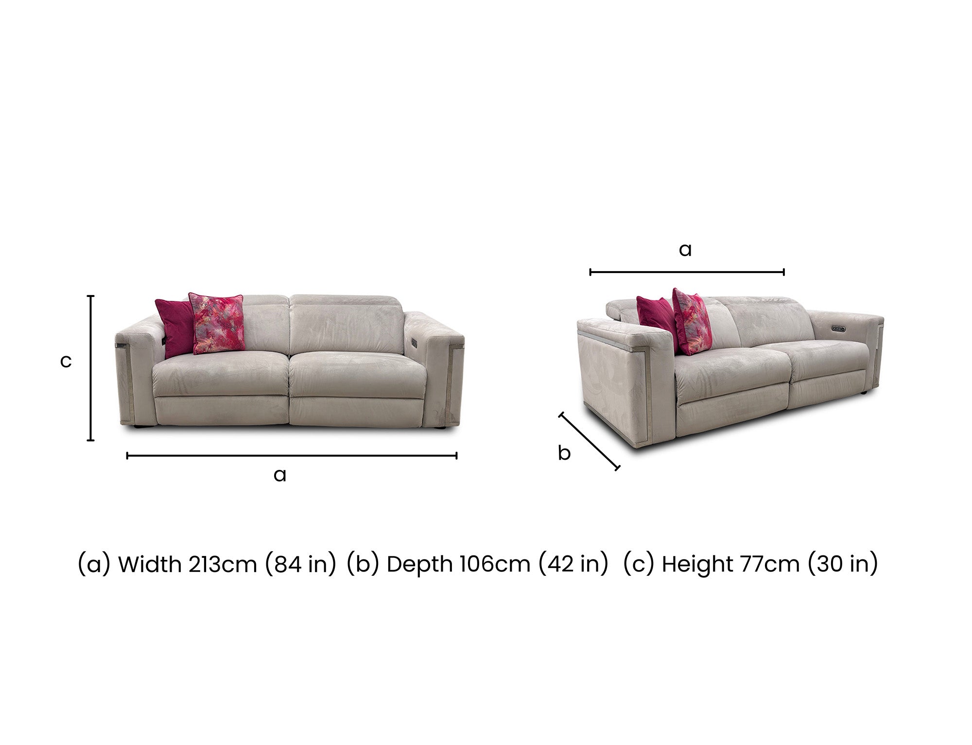- The Fabb 'Cora' 3 Seater Sofa is a luxurious and contemporary piece of furniture, featuring silver velvet upholstery and adjustable electric power recliner headrests.