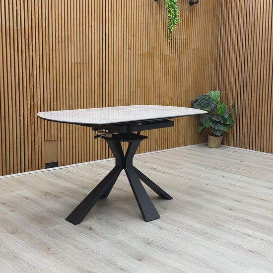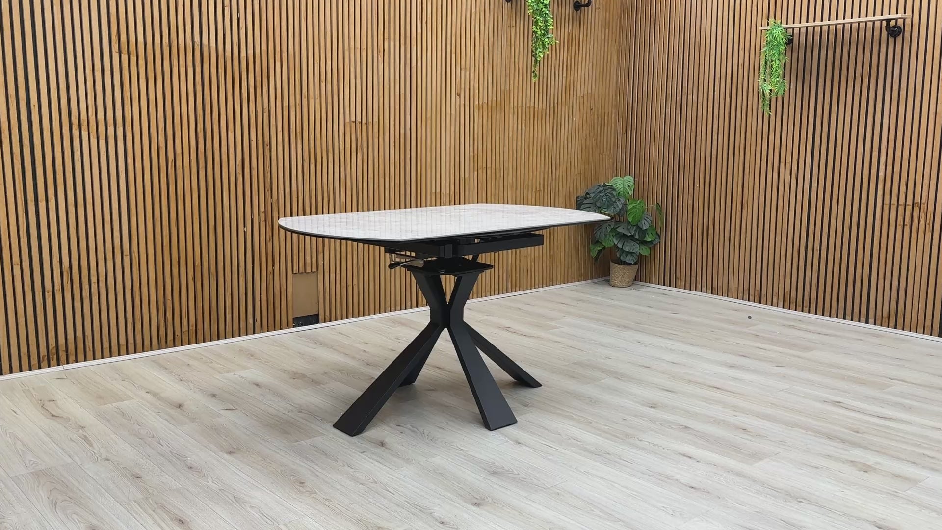 - This round extending dining table has a stunning high-gloss white ceramic top.