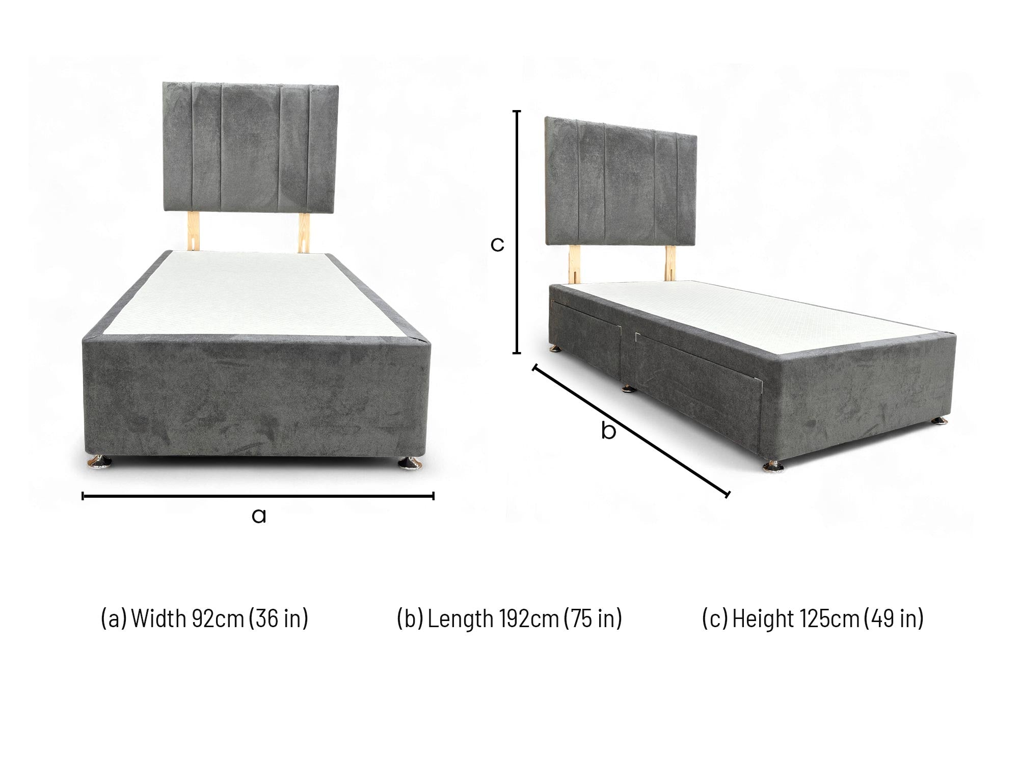• The Highgrove ‘Cygnus’ Milan Thunder Velvet Headboard with 2 Draw Divan Base in Single size is a stylish and contemporary addition to any bedroom.