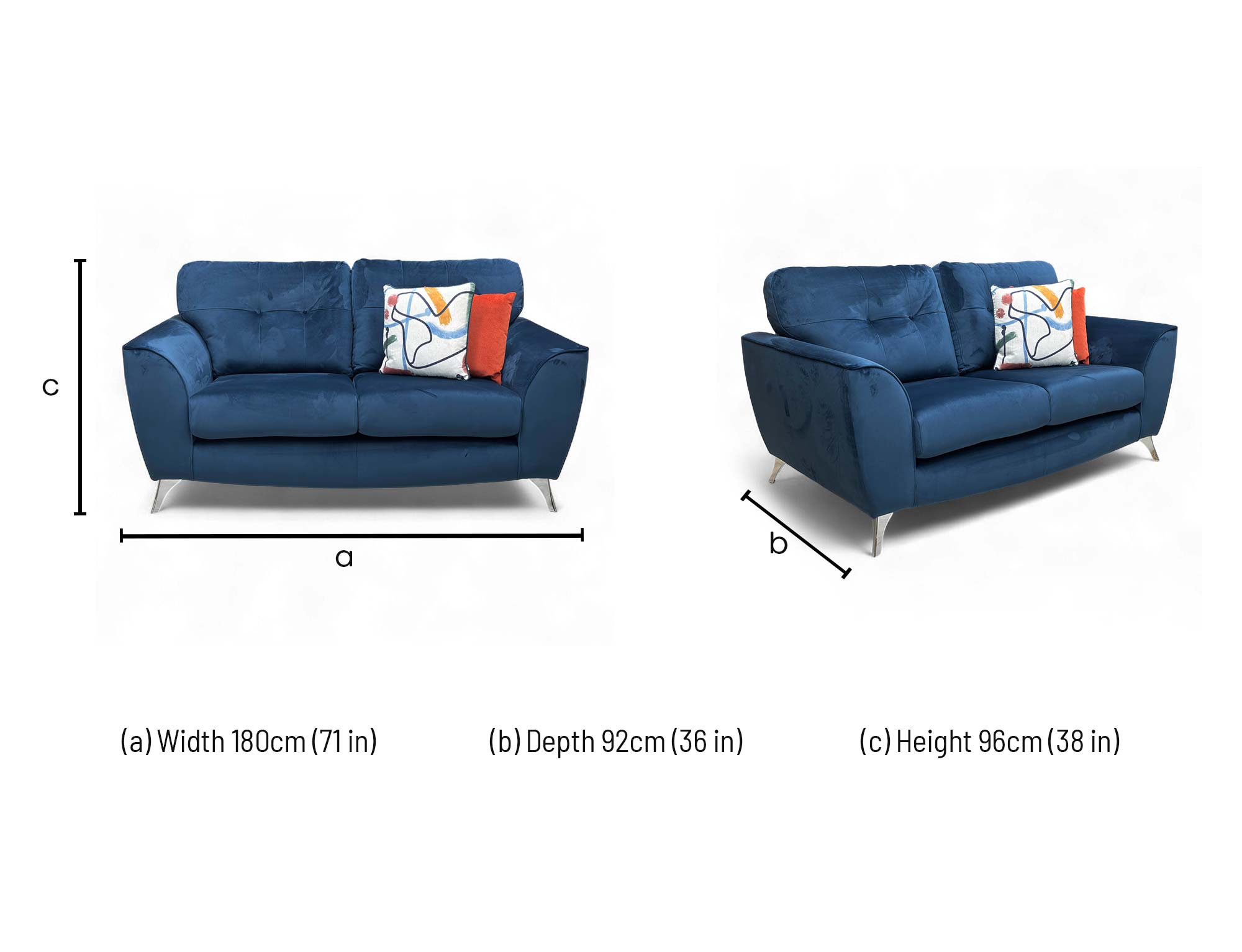 The Dawson is a sophisticated two-seater sofa that brings refined elegance to any living space. Upholstered in sumptuous navy blue velvet, this piece combines luxurious comfort with timeless design. The soft, tactile fabric creates an inviting seating experience whilst the classic silhouette ensures it complements both contemporary and traditional interiors. Perfect for intimate seating arrangements, the Dawson offers the ideal balance of style and functionality for discerning homeowners seeking quality furniture that makes a statement.