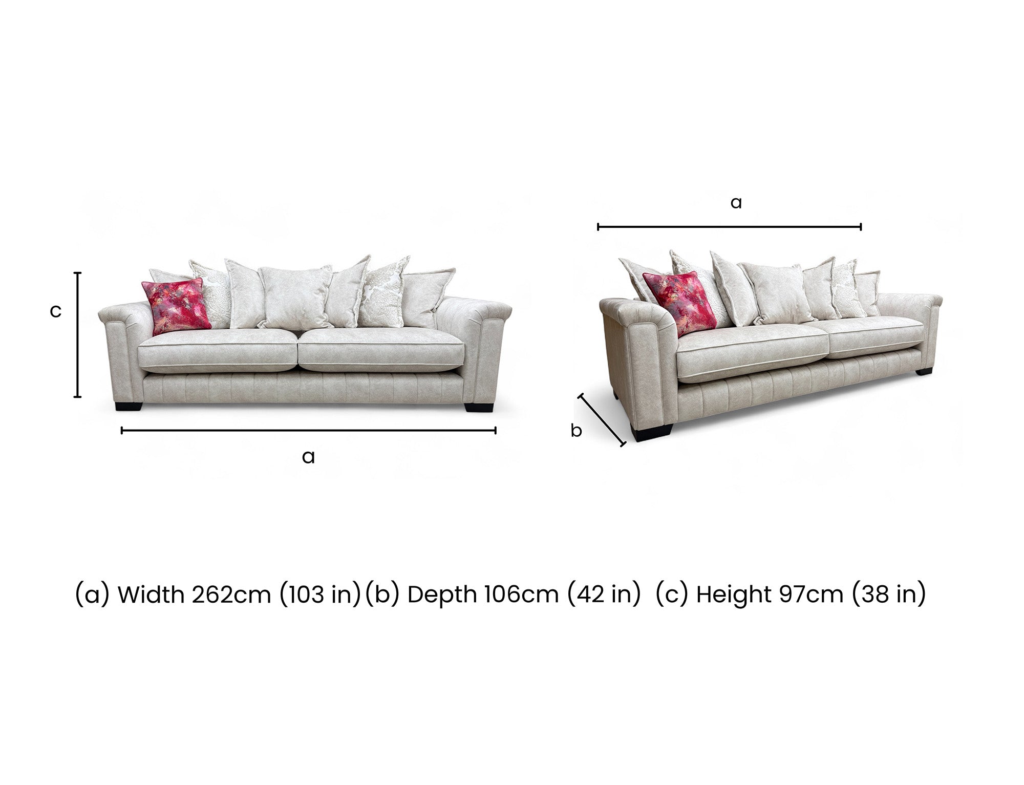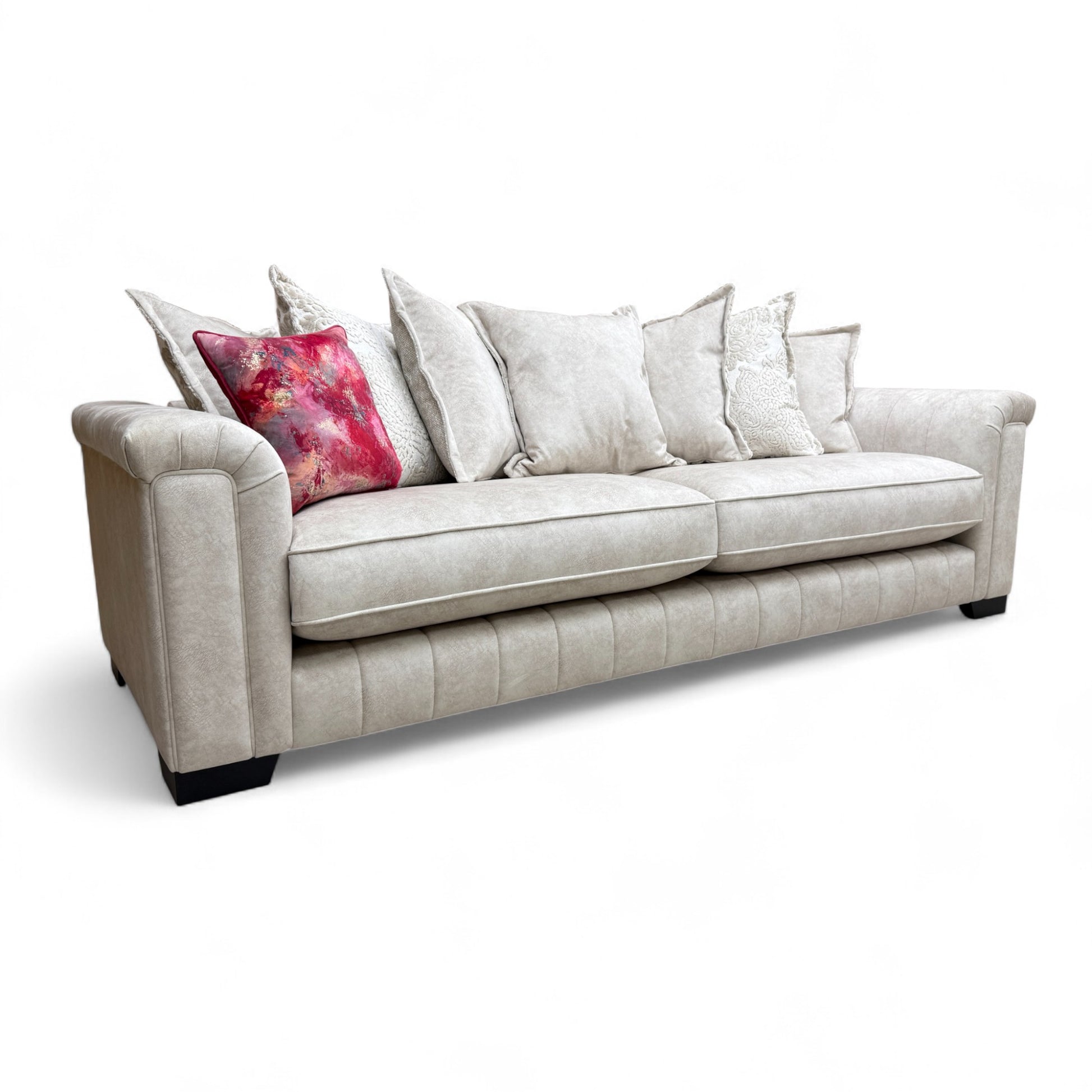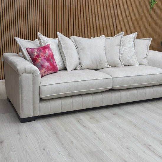 The 'Dolce' Cream Combination Pillow Back Grande Sofa combines elegant design with superior comfort. Its plush pillow-back cushioning provides excellent support, while the cream upholstery adds a timeless, versatile look to any living space. Crafted for durability and style, this spacious sofa is perfect for both relaxing and entertaining, making it a sophisticated centerpiece in your home.