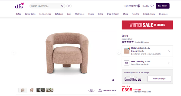 - The DFS 'Essie' Accent Chair in Blush is a brand new, contemporary/ modern style chair designed for the bedroom, living room, or home office/study.