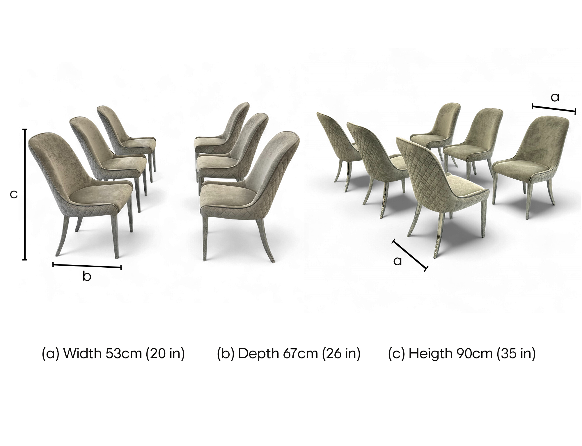- The Furniture Village 'Gabana' Stone Velvet Set of 6 dining chairs features a contemporary style with metal legs, upholstered in plush velvet fabric in a stylish stone colour.