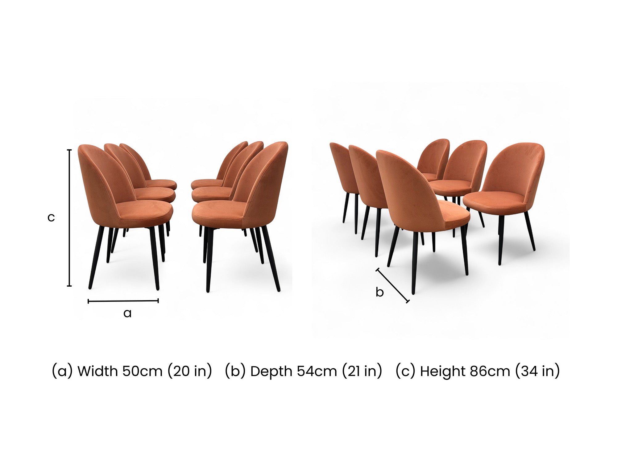 The 'Gabi' Coral Velvet Dining Chair set of six combines luxurious comfort with striking design. Upholstered in soft coral velvet, these chairs add a vibrant yet elegant touch to any dining room. Their sturdy frame ensures durability, while the plush cushioning provides exceptional support for prolonged seating. Perfect for both everyday dining and special occasions, this set offers a refined and inviting seating solution that elevates your dining experience.