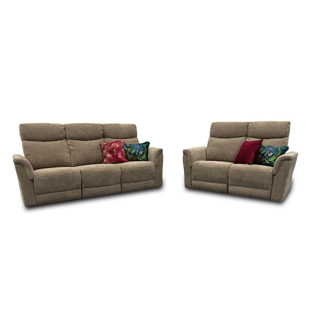 'Maude' Mocha Tight Weave Fabric 3 + 2 Seater Power Recliner Sofa