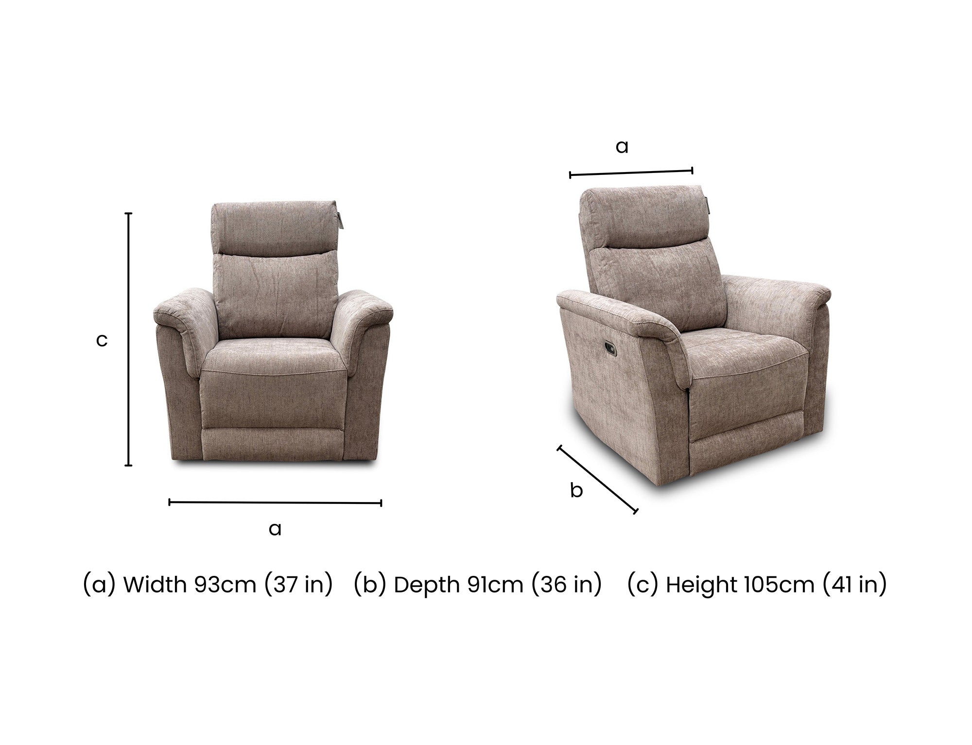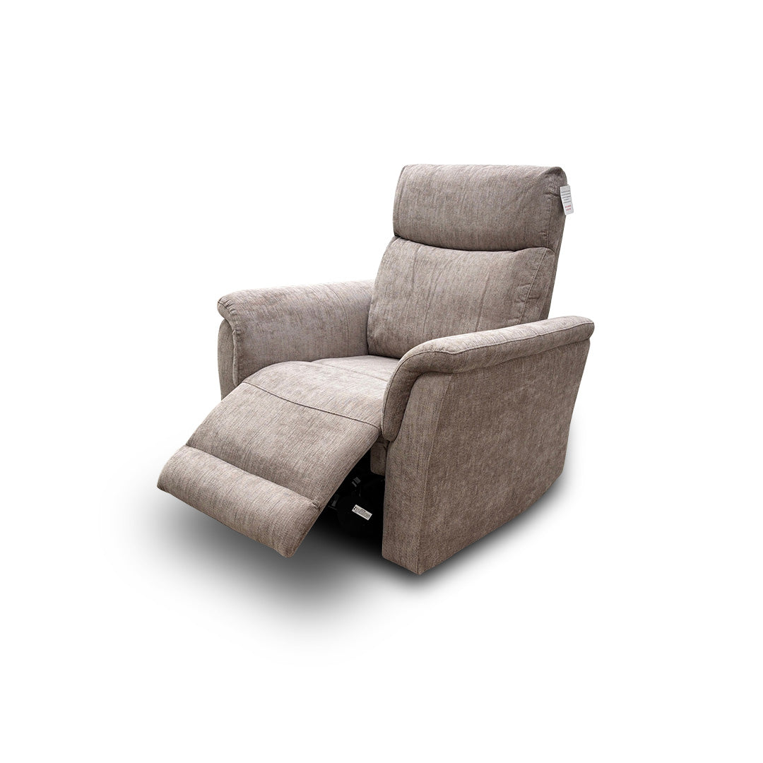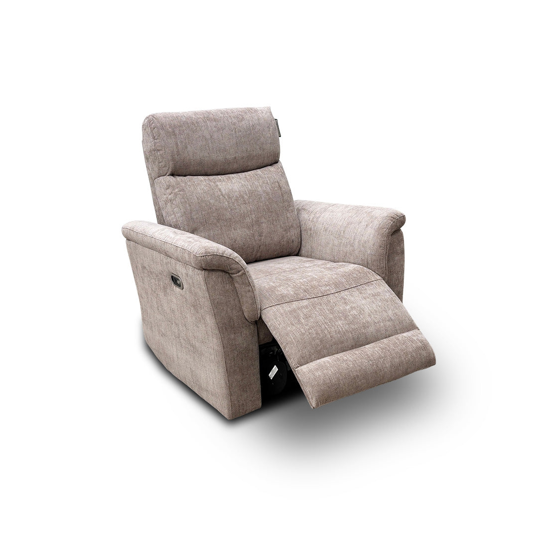 • The 'Maude' armchair in mocha tight weave fabric is a stylish and comfortable power recliner single chair with a high back.
