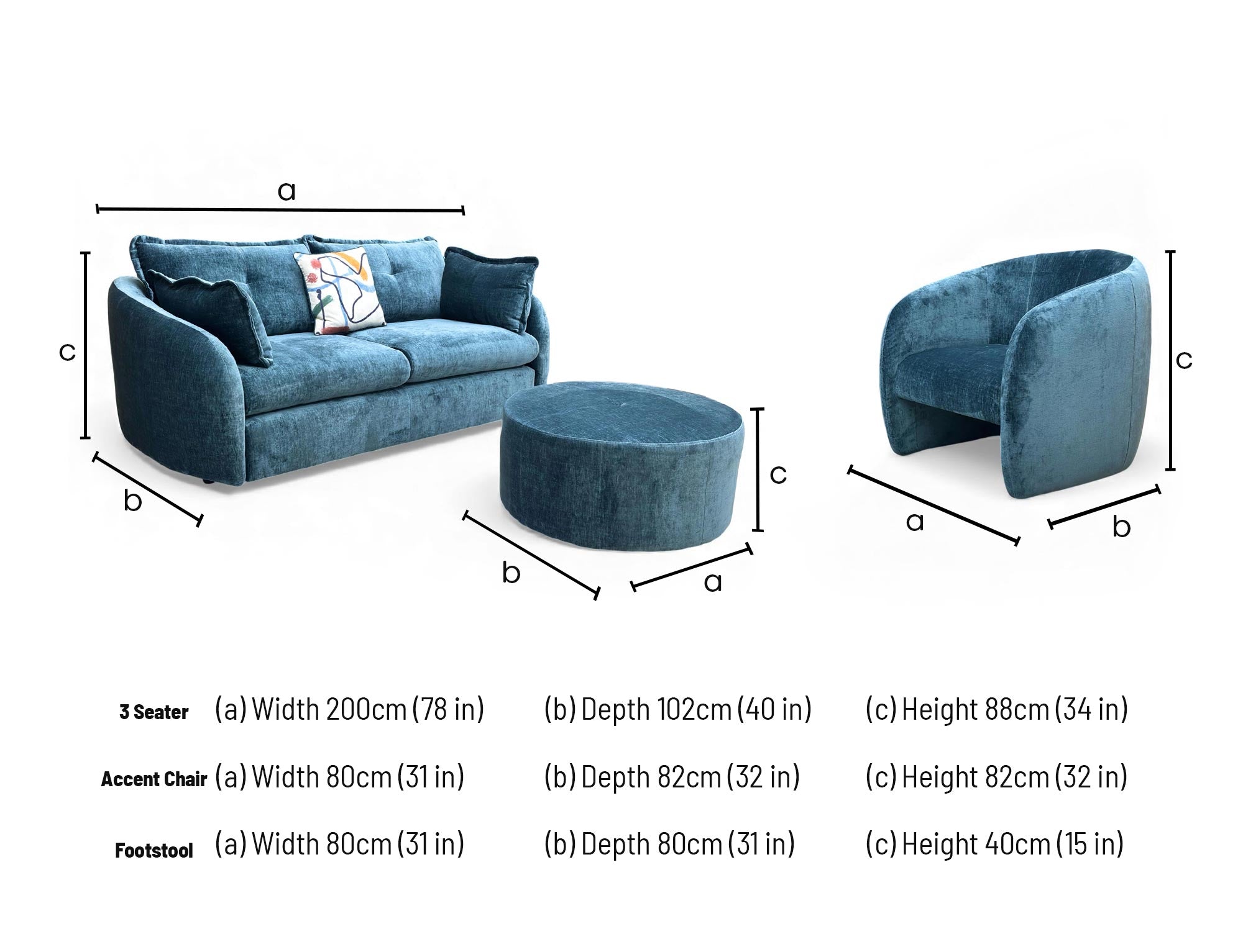• The Sofology ‘Portobello’ 3 Seater Sofa, Accent Chair, and Footstool in Chenille Blue is a stylish and comfortable seating set for your living room.