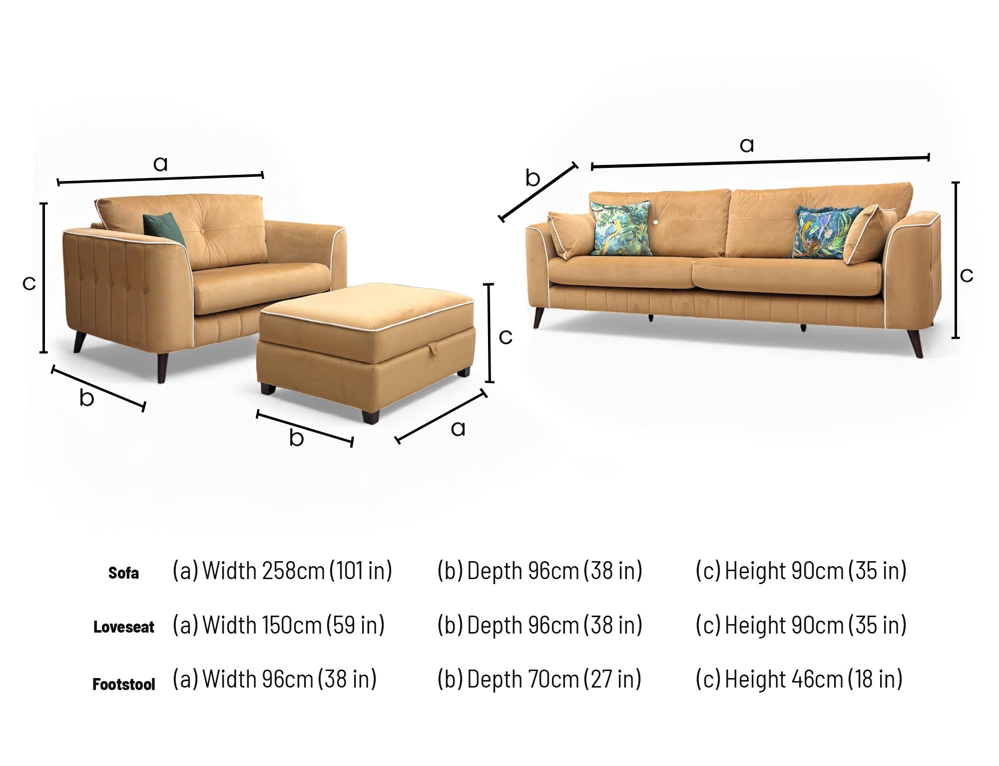 ‘Remy’ Super Matt Velvet Caramel All Over with Ecru Contrast Piping Grande Sofa + Loveseat + Large Storage Footstool