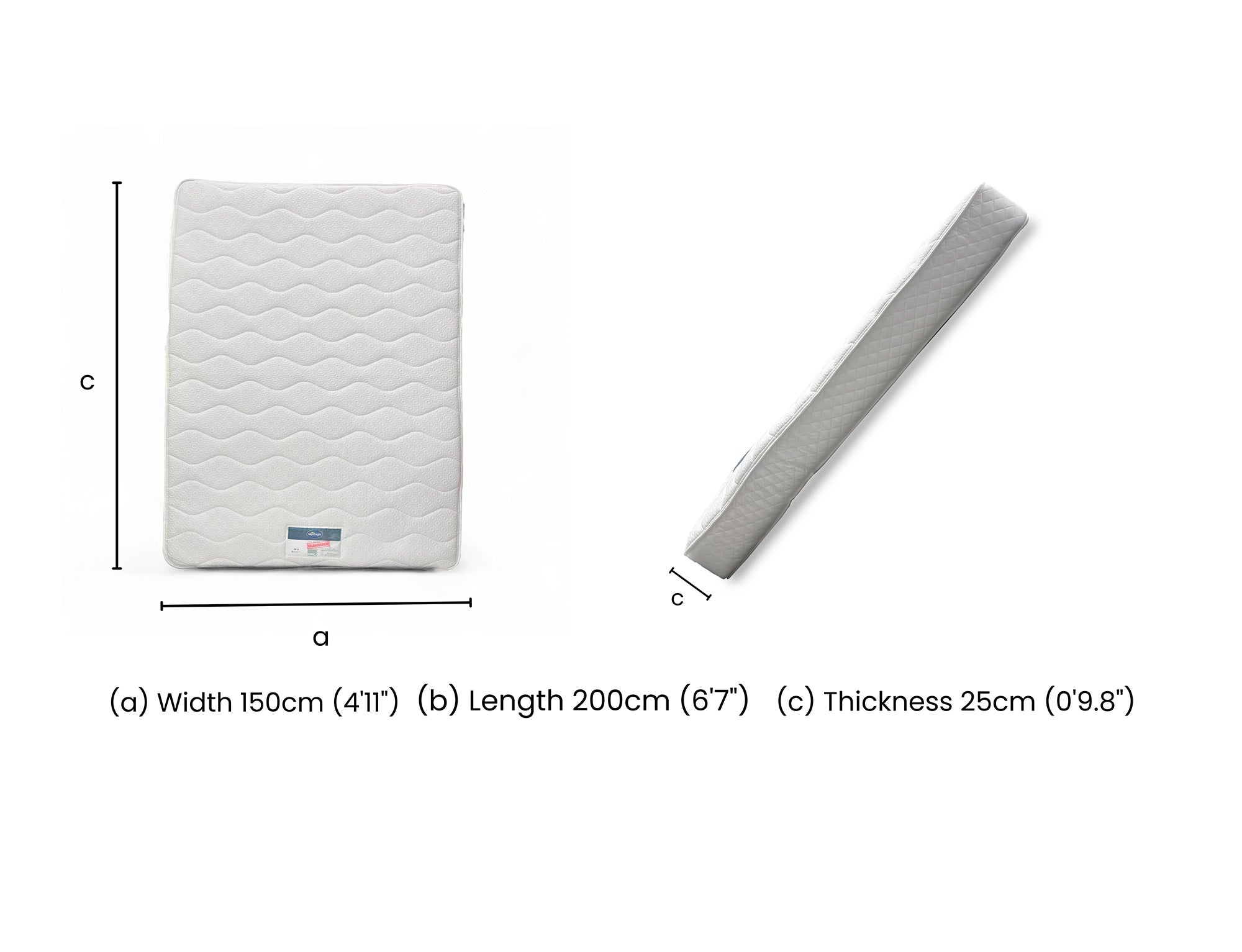 - With a solid white colour, a medium firmness level, and a thickness of 25 cm, this contemporary mattress offers a modern design with a breathable fabric cover that ensures a refreshing feel.