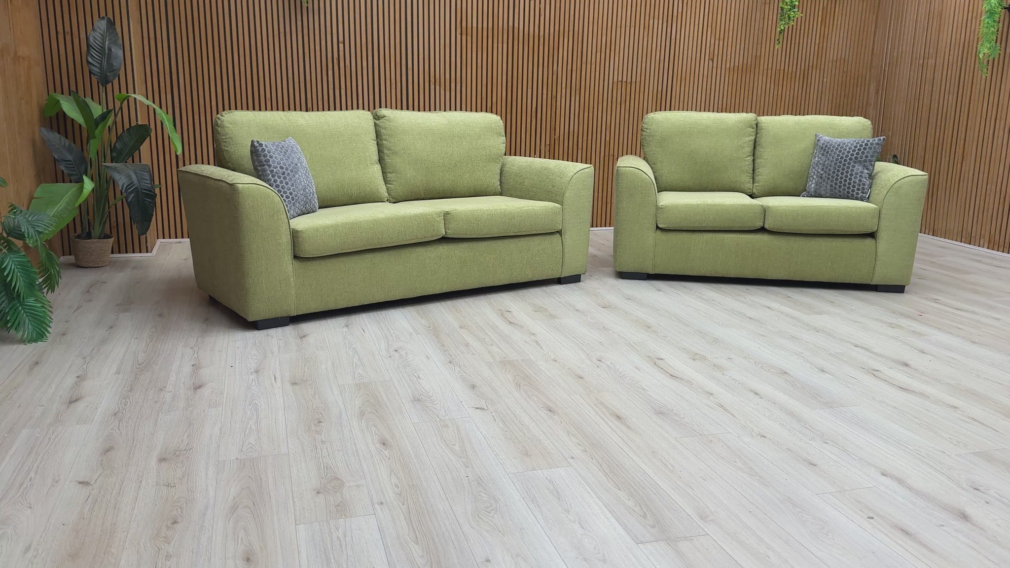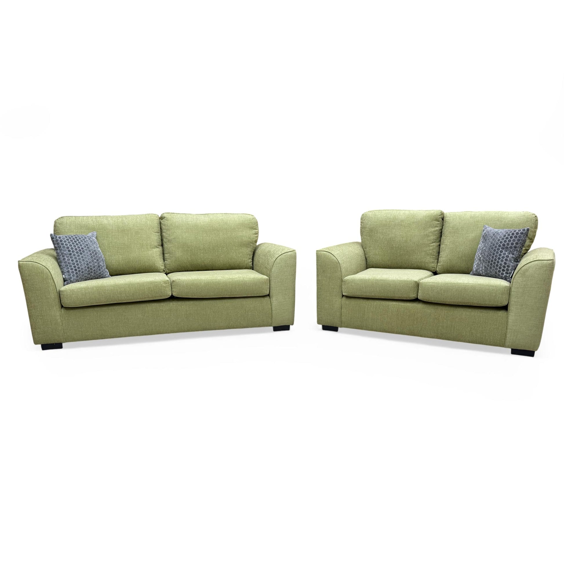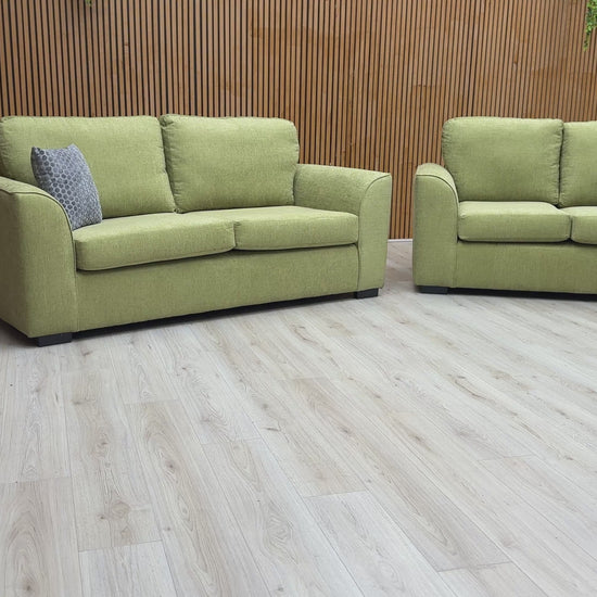• The 'Stamford' 3 + 2 seater sofa set in lime green woven fabric is a stylish and modern addition to any living room.