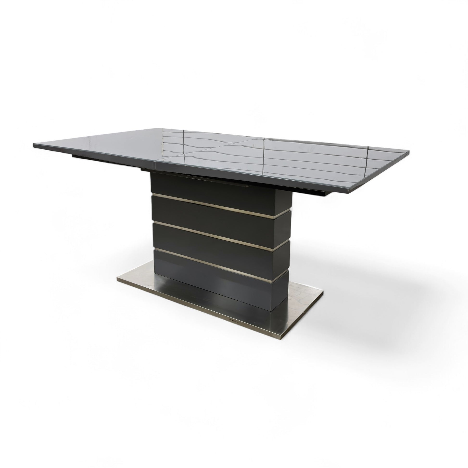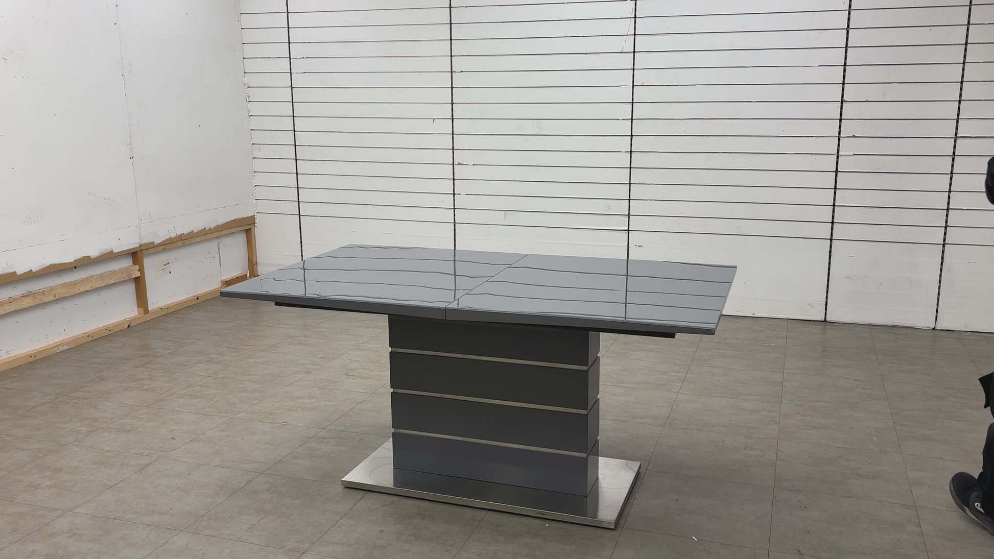 - This rectangular dining table is made with a solid grey colour and features a contemporary design with a glossy finish.