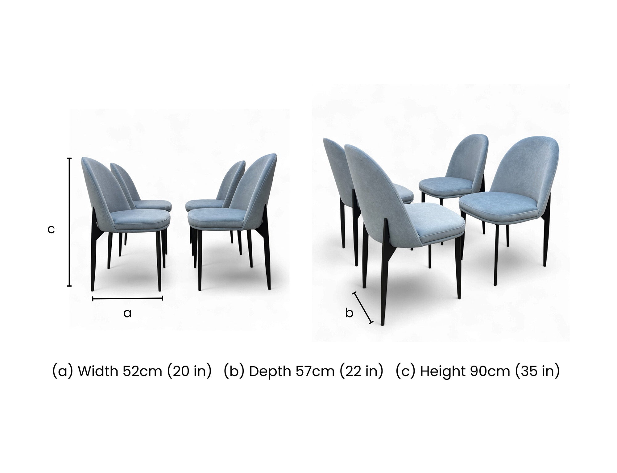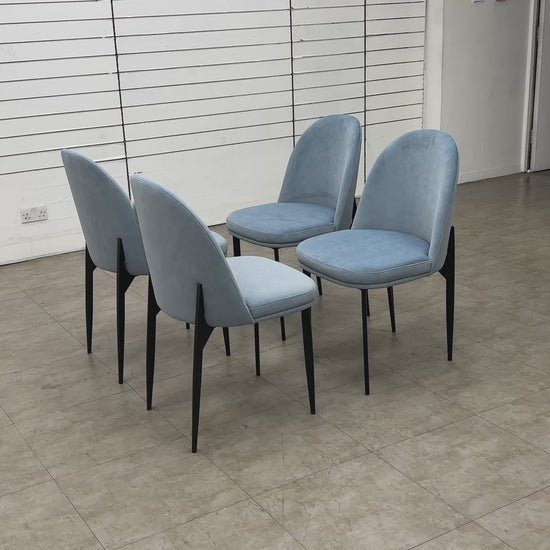 • The 'Valent' Dining Chair Set of 4 in Blue Velvet with a Metal Base is a modern and contemporary addition to any dining room.