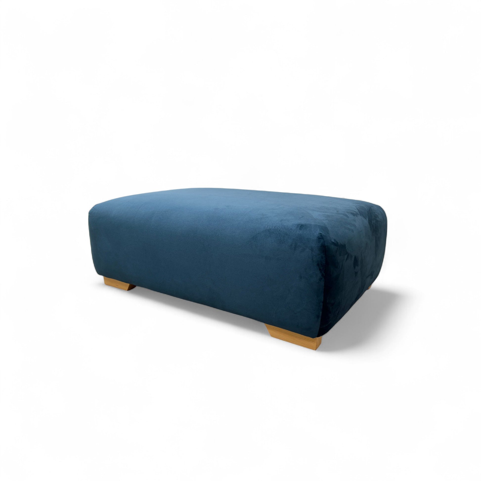 - The DFS 'Zika' Banquette Footstool in Dark Blue Sensual Velvet with Dark Oak Feet is a stylish addition to any living room.